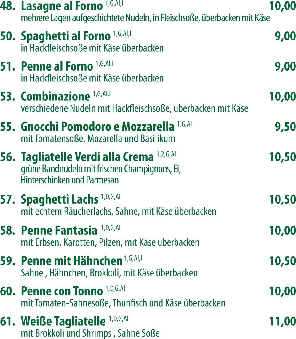 Allergene: Al Weizen, B Meeresfrüchte, C Ei, D Fisch,